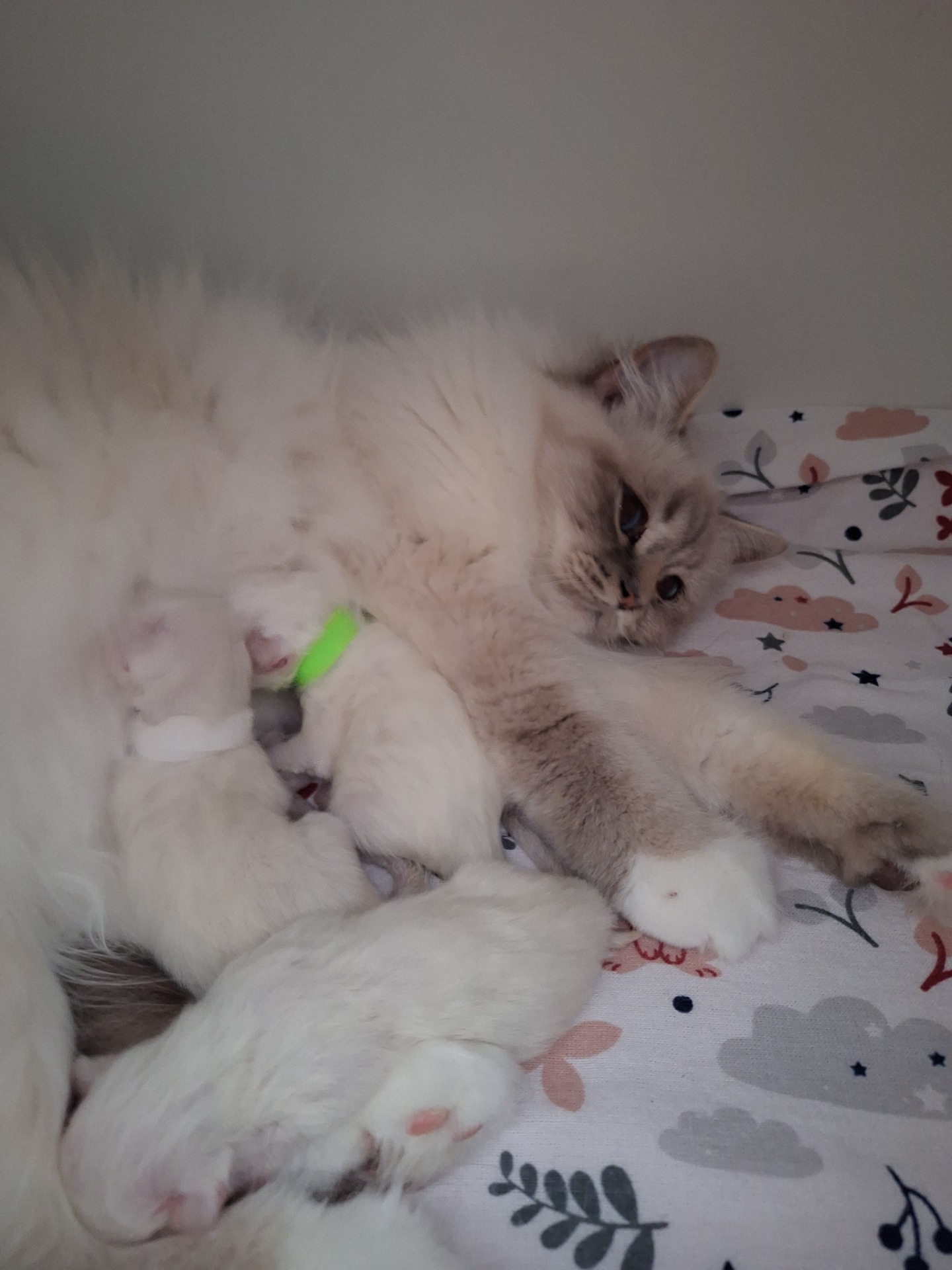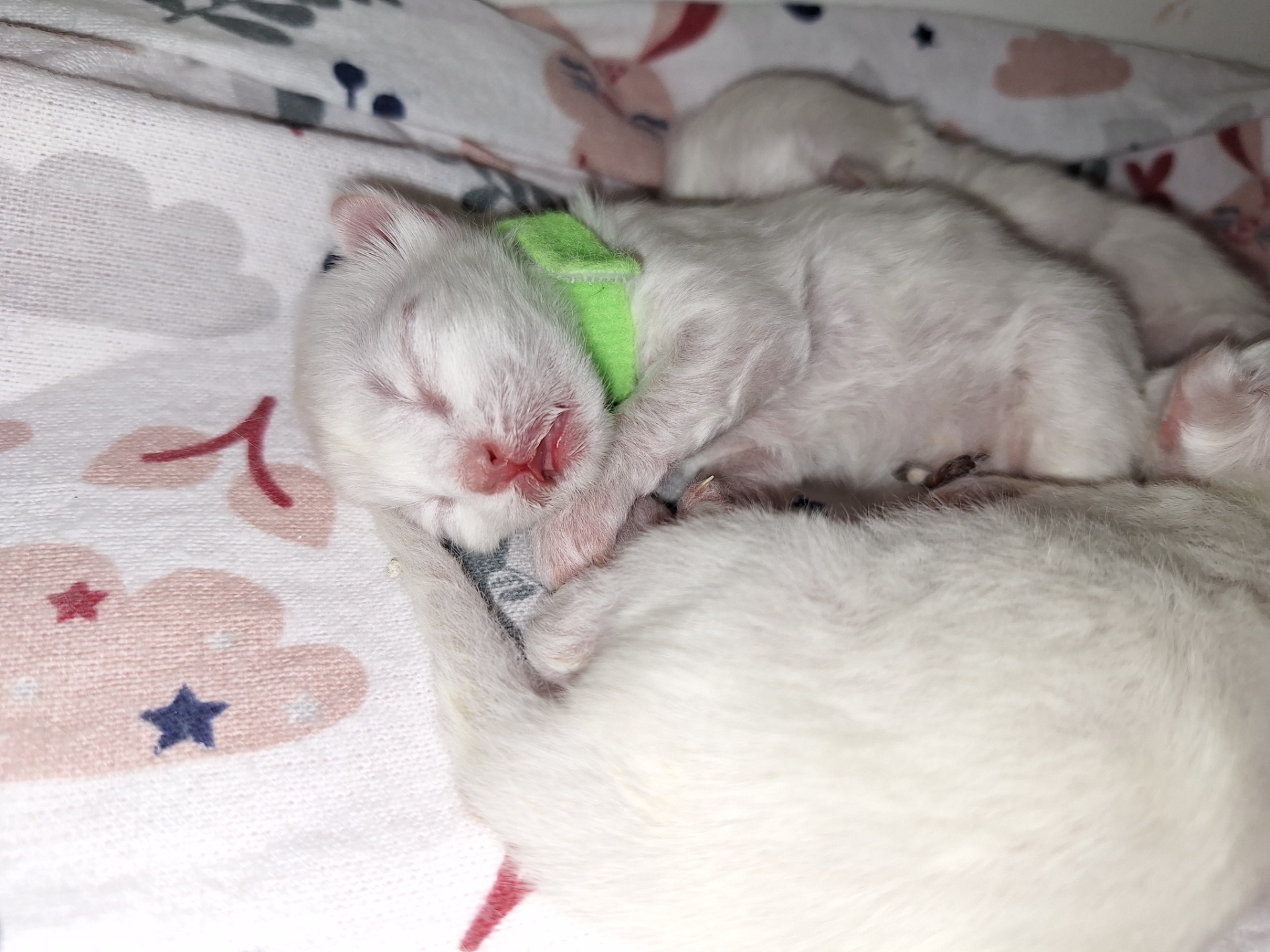 Die Geburt von Belle war wunderbar unkompliziert. Sie hat ihre dritte Geburt fast ohne Hilfe gemeistert und uns drei kräftige Babys geschenkt. Die drei Schätze merkt man kaum, sie nehmen gleichmäßig zu und liegen zufrieden im Nestchen.
